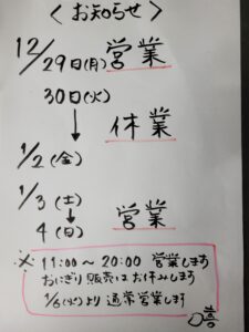 本年もたくさんのご愛顧を賜りありがとうございました。 心より感謝申し上げます。 来年も皆様に喜んでいただける店であり続けられるよう、さらなる向上に努めて参ります。 どうぞよろしくお願いいたします。 なお、年末年始は夜まで […]