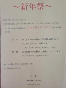 11月2日(日)は11時からの営業です。 なお、おにぎりの販売はお休みです。 11月3日(月)は通常営業です。