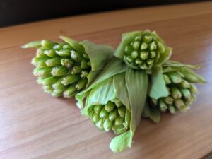 春の訪れを感じさせる「ふきのとう味噌」を作りました。 ほろにがい風味と味噌の優しい甘さはおにぎりの具に好相性です。